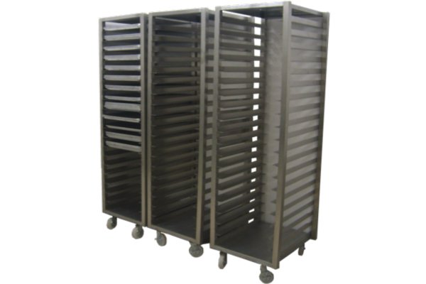 MOD. CRR-055 Mca. Inomex Fabricado con 4 postes PTR de 1X1 de acero inoxidable, Cal. 16. Con piso y toldo el mismo material en Cal. 20 para 18 charolas con guías de lámina de acero inoxidable Cal. 16 T/304. Con ruedas ahuladas y embaladas de 4 Dim. 0.50X0.70X1.80 mts