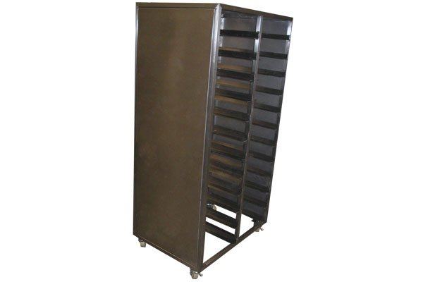 MOD. CRR-100-C Mca. Inomex Fabricado con 4 postes PTR de 1X1 de acero inoxidable, Cal. 16. Con piso y toldo el mismo material en Cal. 20 para 36 guías fabricadas de lámina de acero inoxidable Cal. 16 T/304. Con ruedas de 4 Con tapas tipo charolas de lámina de acero inoxidable Cal. 20 T/304 Dim. 1.00X0.70X1.80 mts